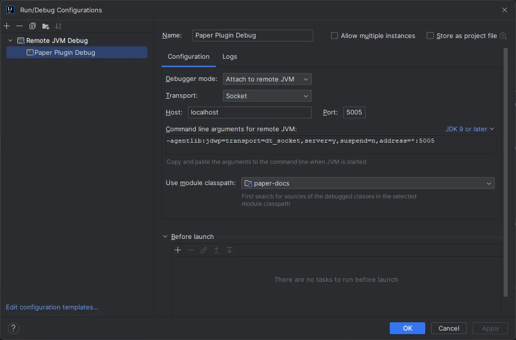 Section titled “Using direct debugging”Direct debugging will allow you to run the server directly from your IDE, and will allow you to use breakpoints and step through your code. We can achieve this by using JPenilla’s Gradle plugin to run the server directly from the IDE. See here for instructions on how to set up the plugin.